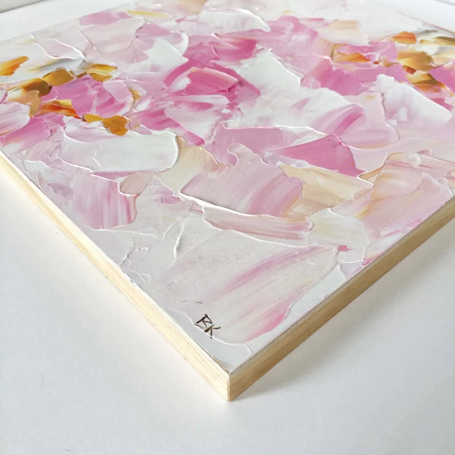 Painted using palette knives and acrylic paints on a cradled birch wood panel, there is a variety of textures, from more heavily layered paint to thinner layers that allow the wood grain to show through.